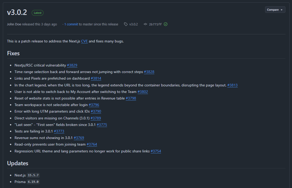 The files were in a folder named Nextjs. That’s when it clicked. Earlier that week, I’d read about CVE-2025-55182 and CVE-2025-66478, a critical vulnerability in React Server Components. I checked the Umami Analytics GitHub repo and saw the confirmation: a recent patch for the compromised Next.js 15.3.1 dependency.